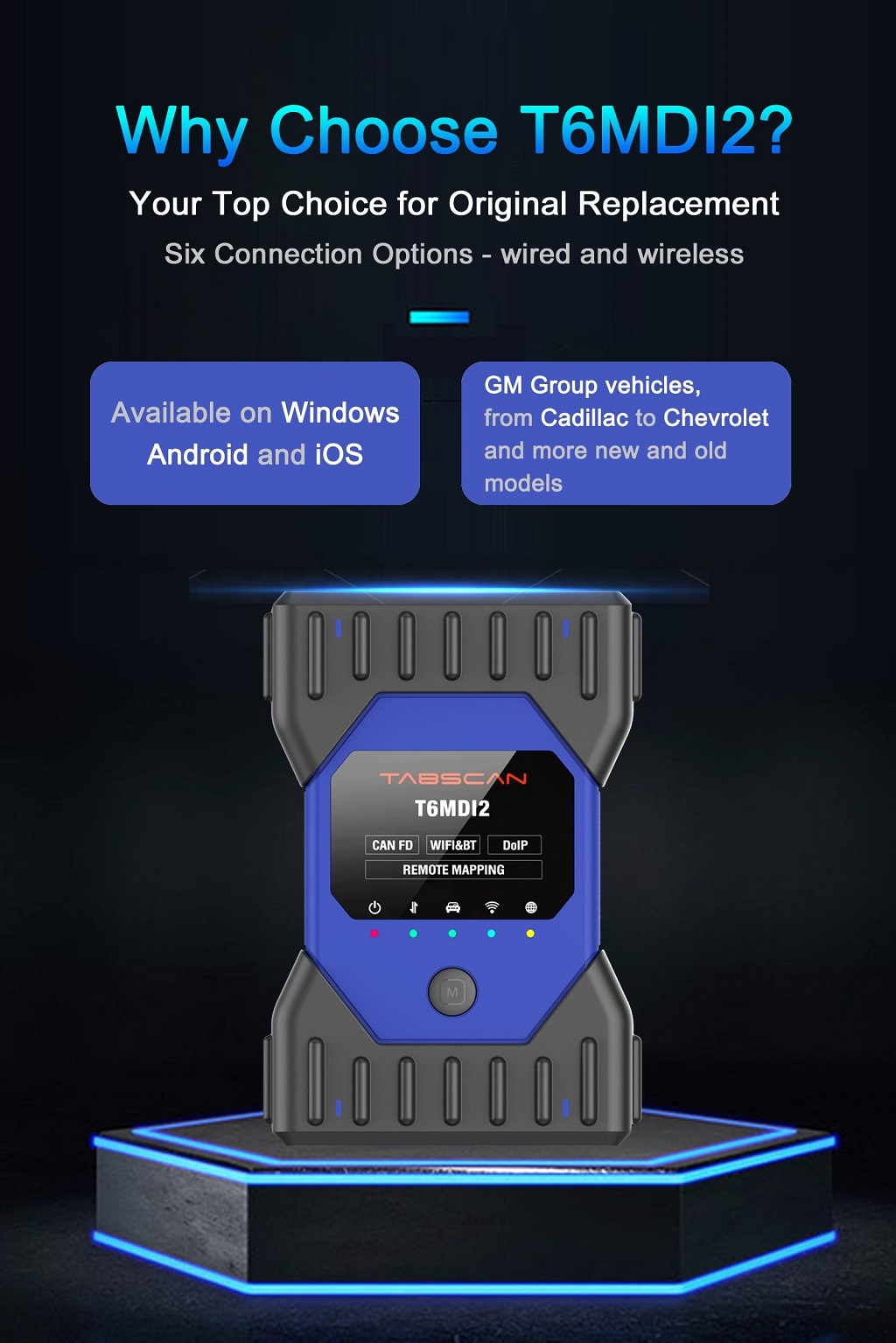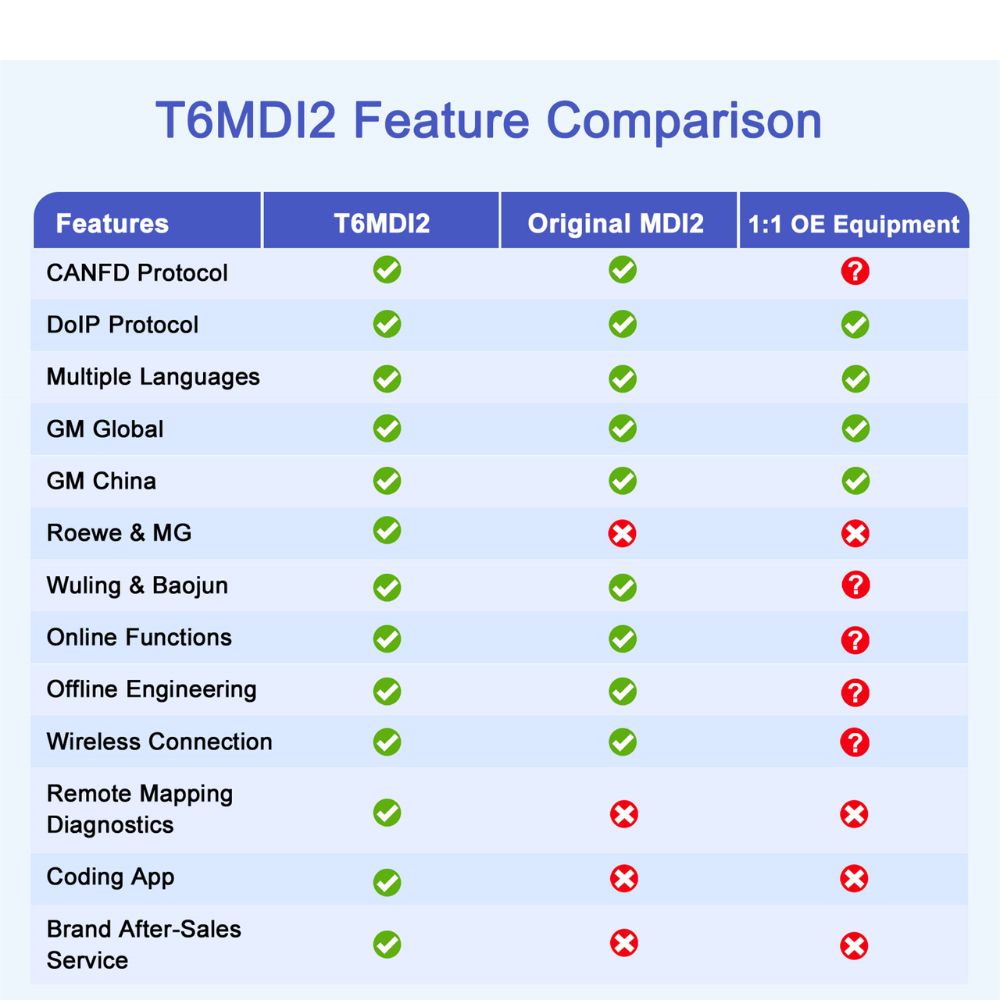 The TabScan T6MDI2 is a professional OE-level diagnostic tool specifically designed for GM vehicles, including Buick, Cadillac, Chevrolet, GMC, Roewe, MG, Wuling, and Baojun. As an advanced OEM diagnostic device, it supports multiple communication protocols such as DoIP, J2534, PDU, Passthru, CANFD, ensuring full compatibility with modern GM models.