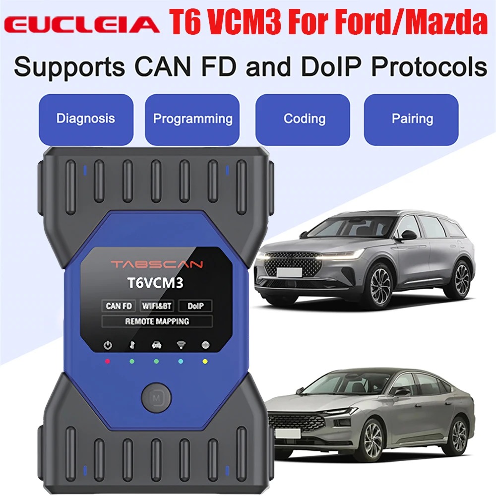 The TabScan T6VCM3 is a professional OE-level diagnostic and programming interface developed by Eucleia Technology for Ford series vehicles. As an advanced OBDII and J2534 Passthru device, it supports the latest automotive communication protocols including DoIP, CAN FD, PDU, and Passthru, ensuring compatibility with new-generation Ford and Lincoln models.